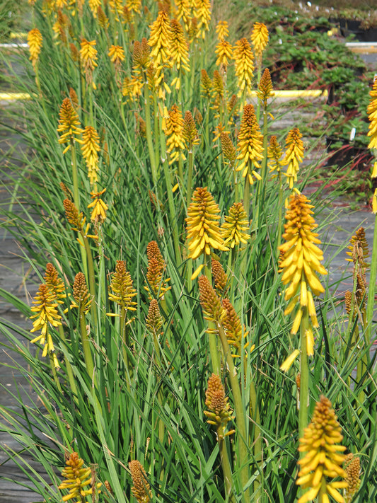A new recurrence flowering Kniphofia! Wave after wave of tall spikes of densely packed soft orange-yellow tubular blooms are borne from spring to fall on this exciting new cultivar of this reliable perennial. Excellent for hummingbirds.