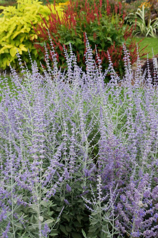 Russian Sage has an exceptionally long season of interest. This compact selection forms a bushy upright clump of fragrant, metallic, silver leaves bearing abundant spikes of lavender-blue flowers from mid-summer on. Exceptional for hot, sunny sites, in the garden or in containers. Prune plants back no harder than 4 to...