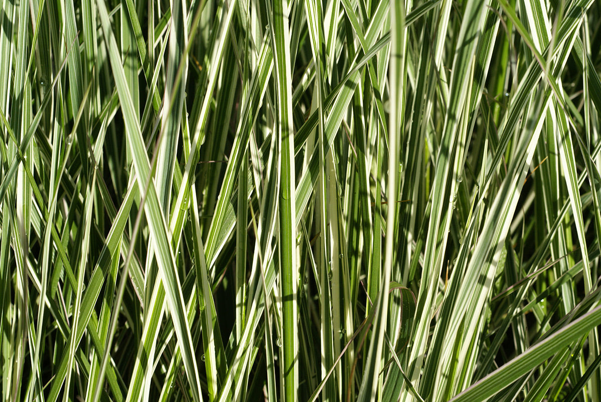Clump forming with distinct wide, bright white band down the center of each green leaf, topped with silvery tan plumes starting in July-Aug.