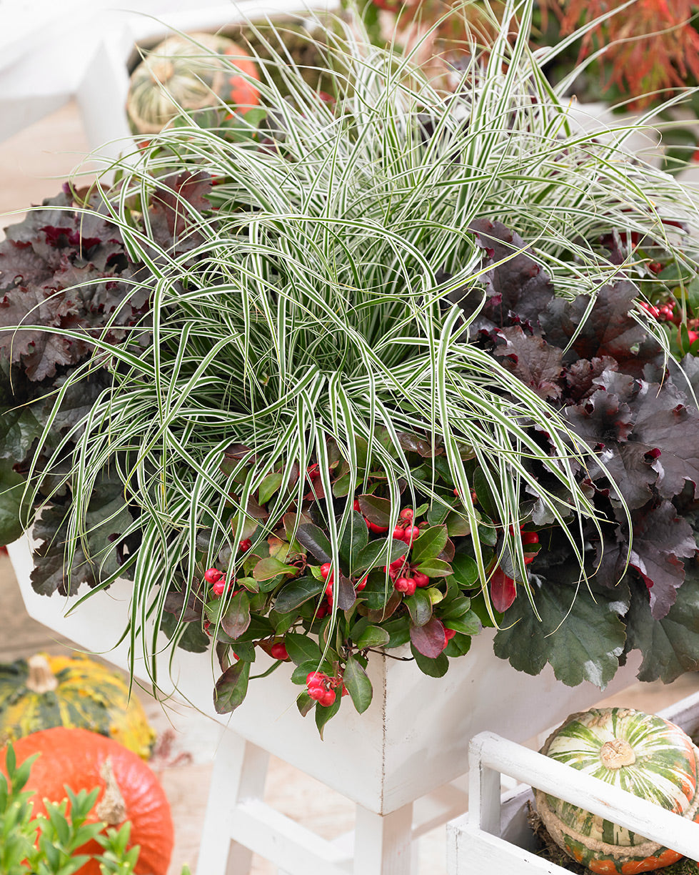 A garden dazzler that thrives in any season, Variegated Japanese Sedge is like a ribbon of sunlight weaving through your landscape. Its slender, arching blades shimmer with creamy yellow centers framed by deep green edges, creating a cascade of luminous texture. Whether spilling over the edges of containers, framing borders...