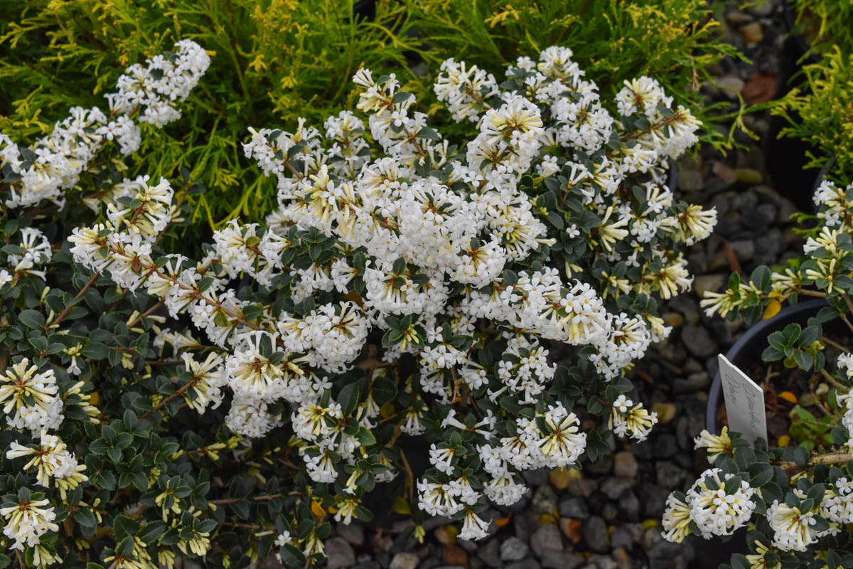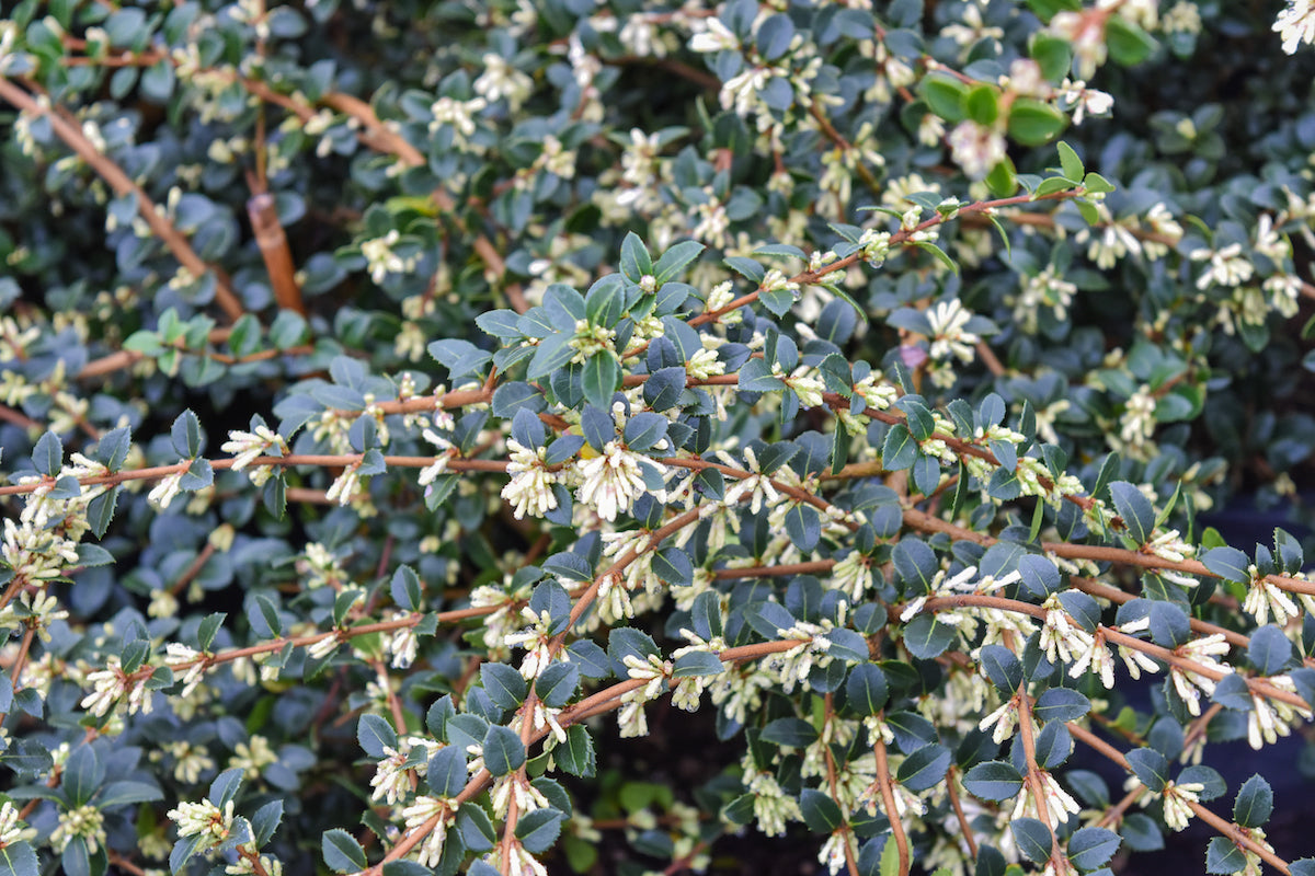 It’s very dark foliage and fine texture create a punctuation mark in the perennial border and provide winter interest when other plants are dormant. Combining tiny, deep dark green leaves and small, fragrant, tubular white flowers, this evergreen shrub provides year-round interest. Delavayi’s osmanthus can be clipped to form a hedge or screen or left to grow naturally.