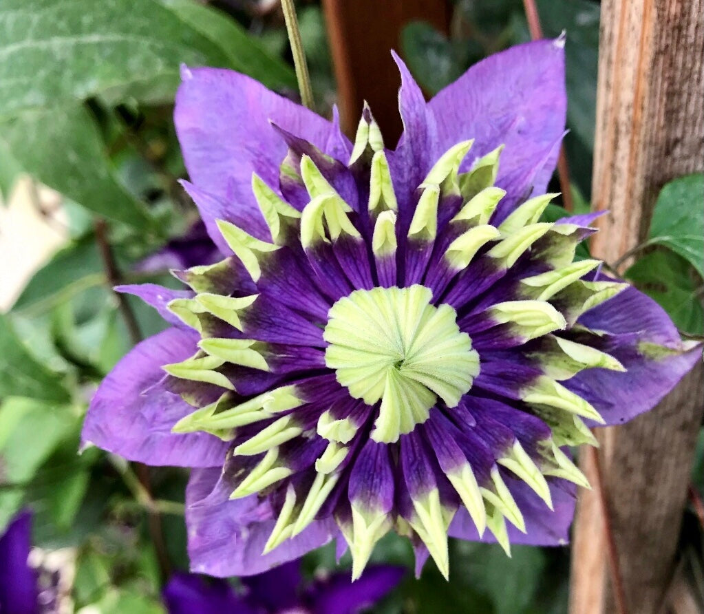 Exotic-looking double flower with violet petals and green-white tips. This one-of-a-kind Clematis will bloom from spring to fall. Compact enough to grow in a container with a trellis, or in the landscape. Pruning group C.